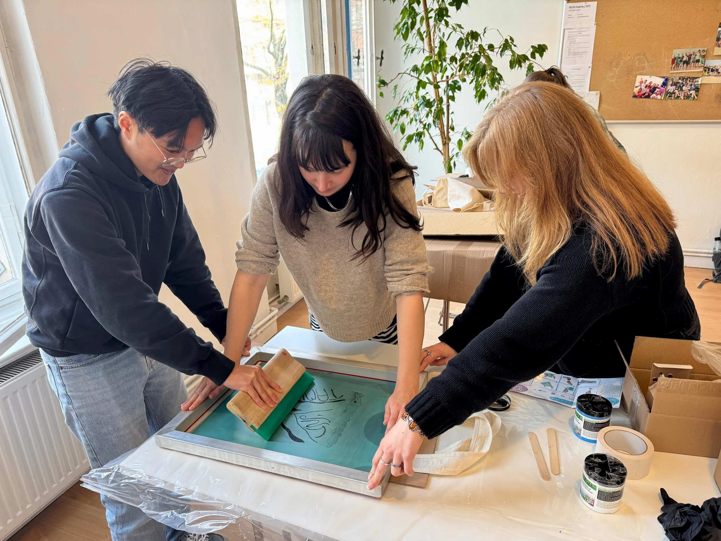 Wir waren aber nicht nur mit unseren Köpfen kreativ, sondern auch mit unseren Händen und haben fleißig T-Shirts und Taschen gedruckt, die wir an aktive Mitglieder, bei Messen oder an zukünftige Freiwillige verteilen wollen.